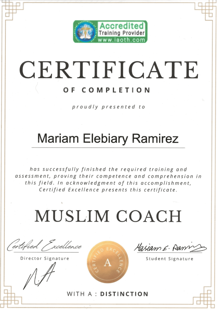 Sister Mariam is a Certified Islamic Life Coach, having completed formal training in Islamic life coaching methodologies rooted in Qur’anic principles and Islamic ethics. Her certification reflects a structured, faith-based approach to personal development, reflective guidance, and ethical coaching practices.